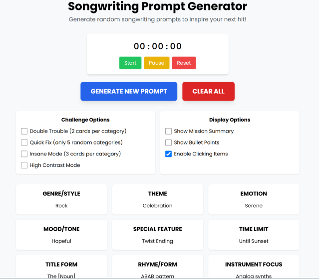 (I’ve been tinkering with song-writing prompt apps and games for years, and this one has the most working buttons and functions… from the infamous CANVA CODE (which I love, btw. Were I still teaching at university, I’d be iterating up a storm for my precious kiddies and fellow golden oldies xD